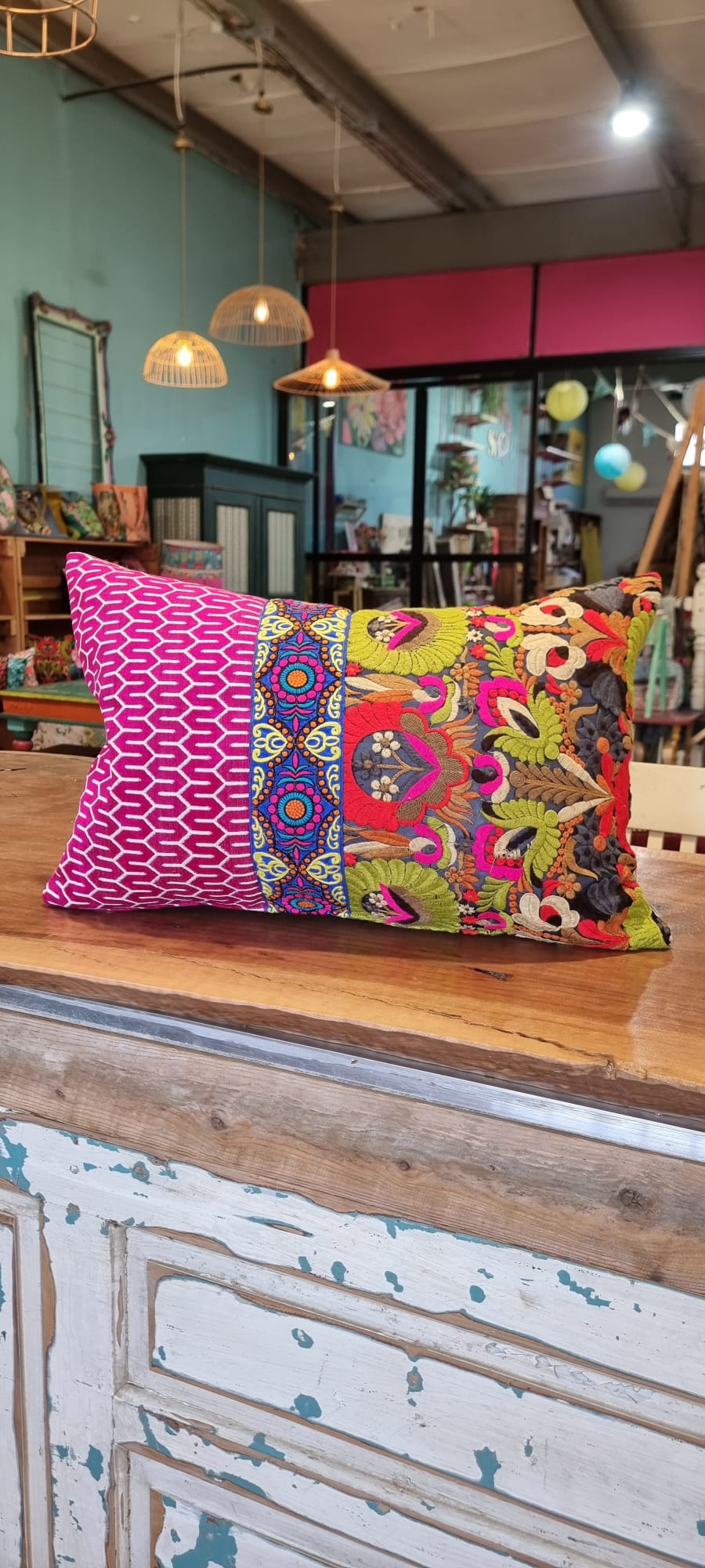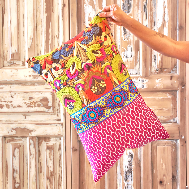 שילוב בדים בין בד רקמה מיוחד לקטיפה עם טקסטורה ופס רקמה שמפריד בינהם.