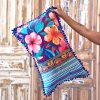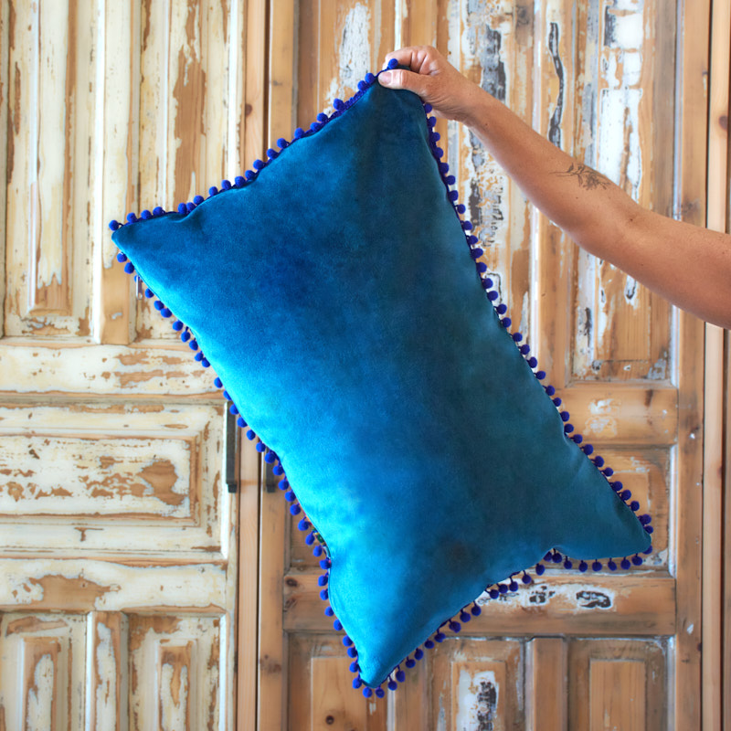 צד שני בד קטיפה טורקיז כהה ופונפונים כחולים מסביב