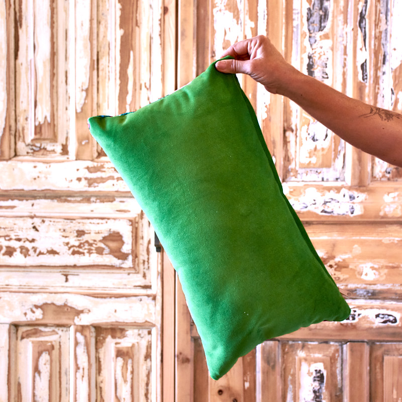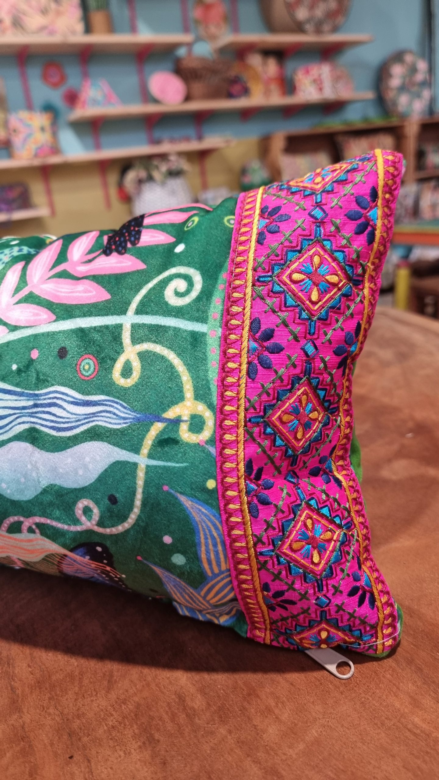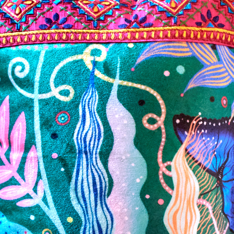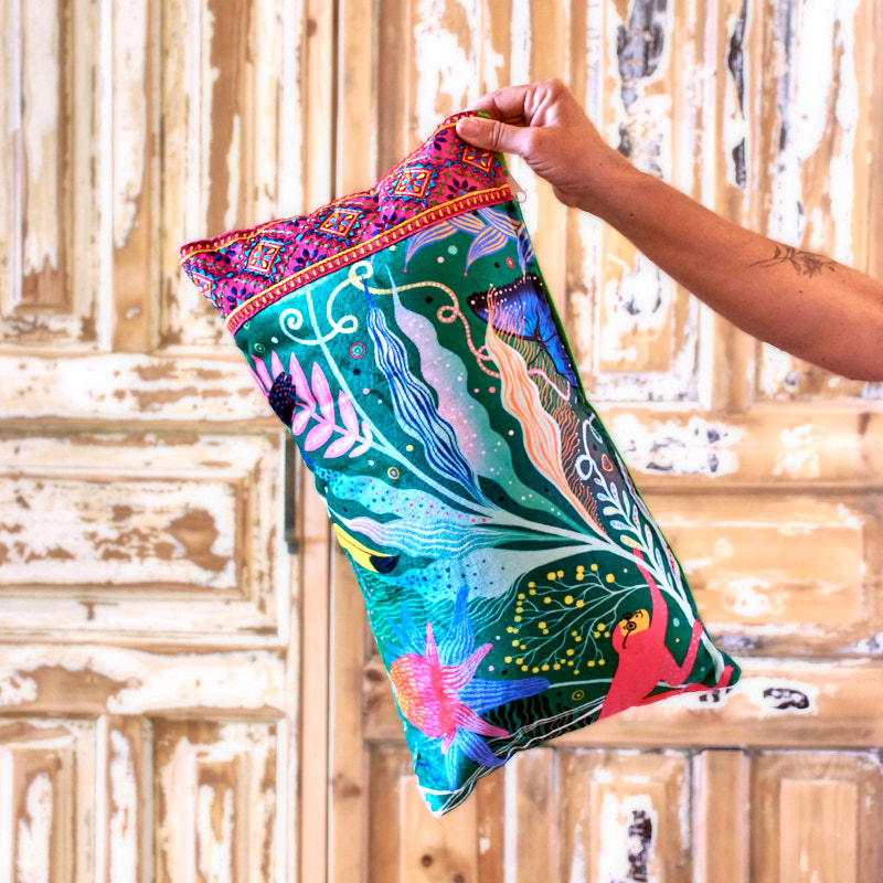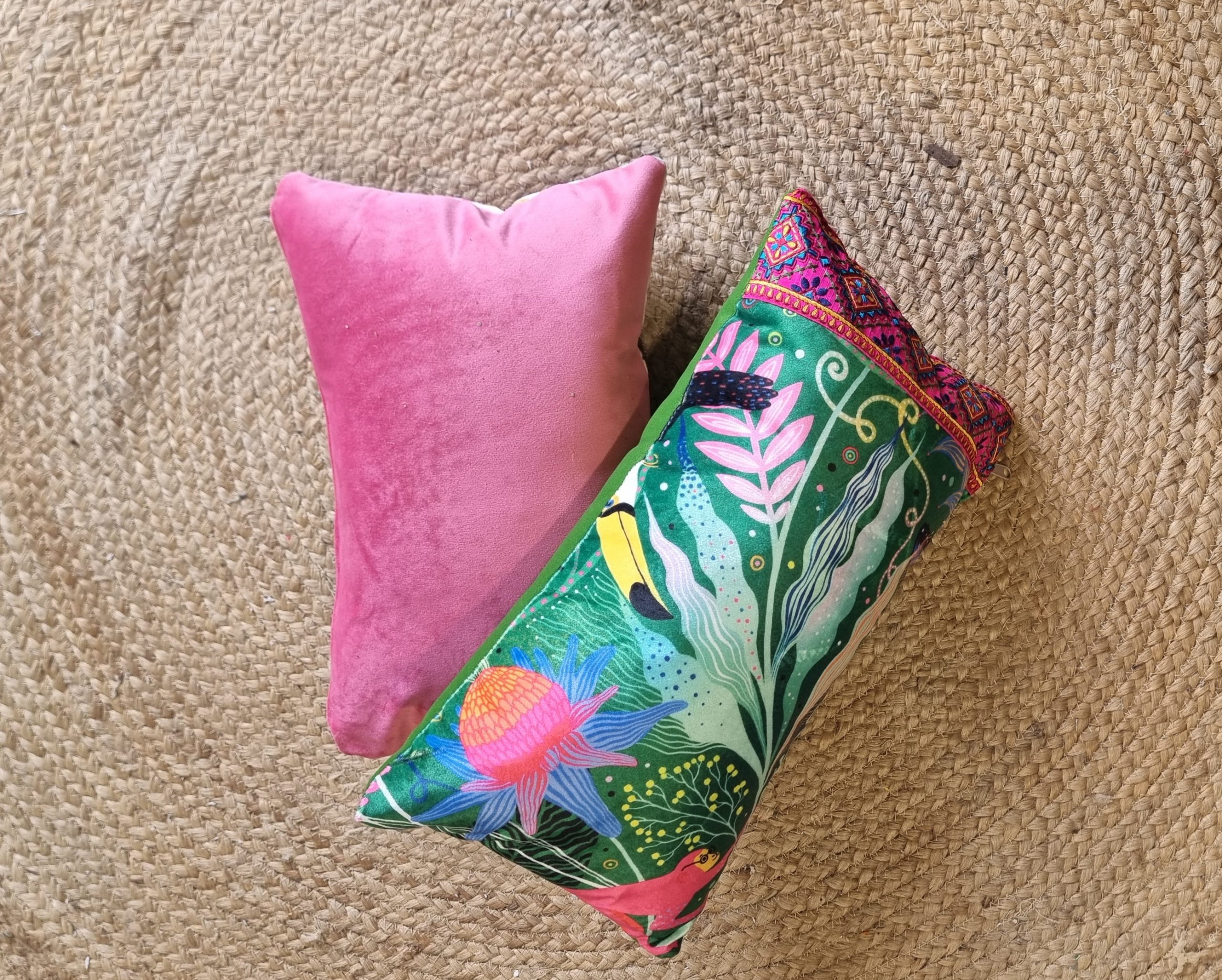 שילוב בדי קטיפה עם הדפסי קוף תוכי ופרחים ופס רקמה