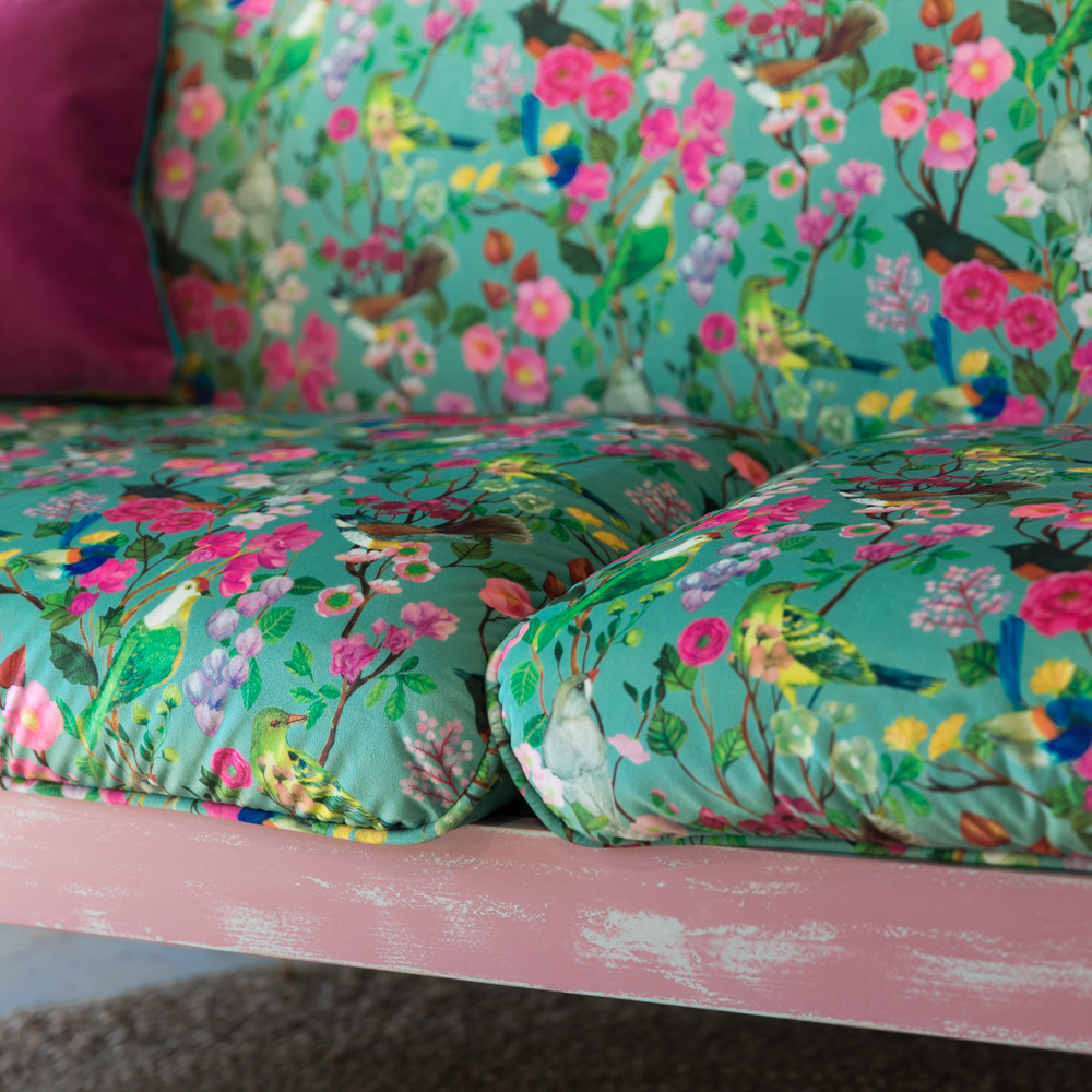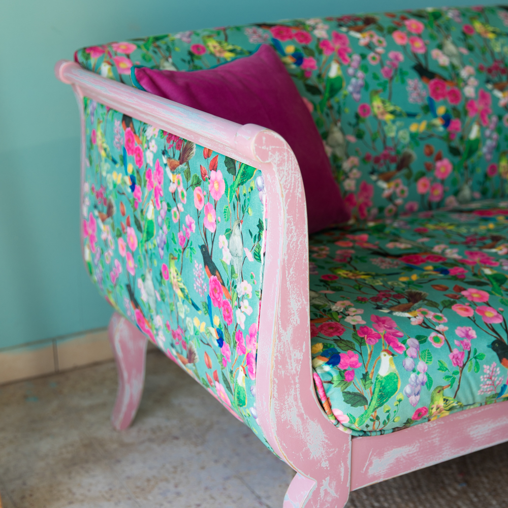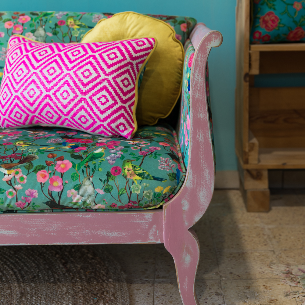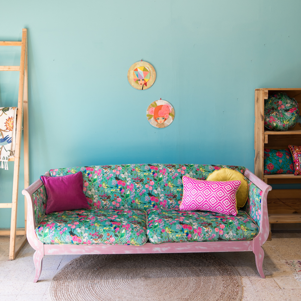 ספה מעץ מלא איכותי, צבועה בטכניקה מיוחדת של שכבות ויישון. מרופדת בנוחות וברכות, בבד קטיפה פרחוני ייחודי ומהמם בייבוא אישי שלנו.